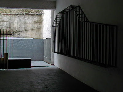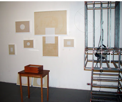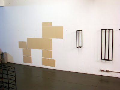 A idéia de uma construção elementar, que na sua versão tridimensional remetia ao empilhamento de blocos de madeira daqueles que brincávamos na infância ou caixas de sapatos organizadas por um vendedor de sapataria atrapalhado, teve sequência no plano bidimensional no momento da organização imprecisa de retângulos coloridos sobre uma folha de papel branca. A parede tomou o lugar do papel e o desalinhamento entre as formas permaneceu como num velho metaesquema de Oiticica, a escala dos trabalhos acima é 4 vezes maior do que os cachorros tridimensionais realizados em mdf (2003) e granito cinza (2004/5). As fotos são do Quito.