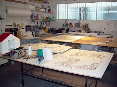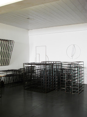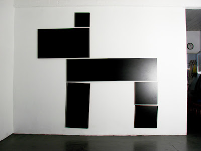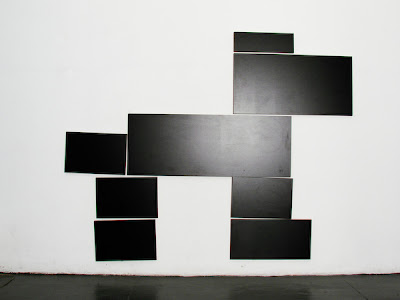 A série Boxer, com cachorros feitos em blocos que teve início em 2003, está subindo pelas paredes. As imagens acima são as 2 primeiras experiências dessa nova fase ainda sem título. Cada retângulo é uma chapa de MDF de 25mm de espessura forrada de fórmica preta.