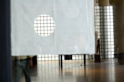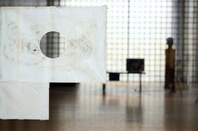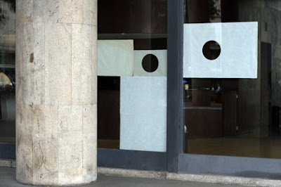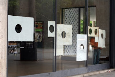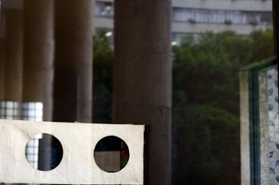 Figuras geométricas vazadas em papel manteiga. Folhas coladas no pano de vidro do Palacio Gustavo Capanema no centro do Rio em dezembro de 2005. Estava procurando essas imagens para subir ao brog já tem um tempo. Hoje o artista plástico/músico Paulo Vivacqua inaugura a instalação sonora Sentinelas no mesmo local. Boa coincidência.