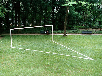 A escultura acima foi apresentada no Parque Lage no Rio em 1993. Tem as dimensões oficiais de uma trave de futebol mais a distância do pênalti. Foi o primeiro trabalho que eu fiz que dialoga com o futebol. A foto é de Eduardo Coimbra.