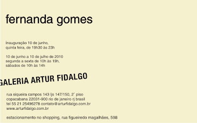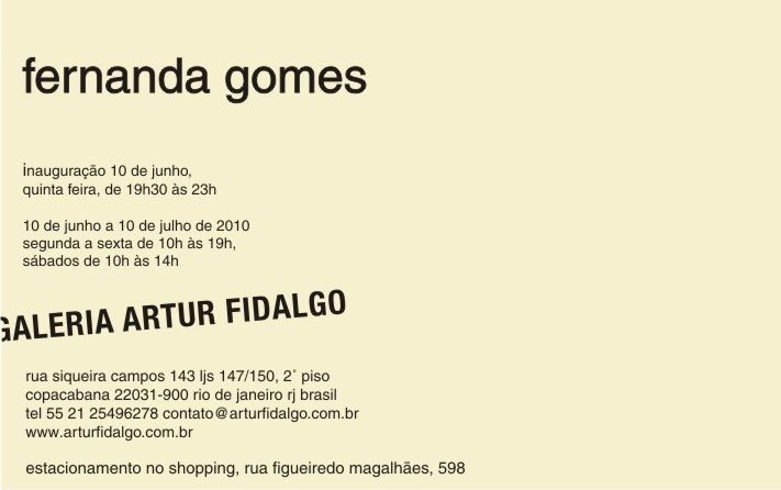 Fernanda Gomes, uma das mais importantes e radicais artistas contemporâneas brasileiras, expõe trabalhos inéditos na Galeria Artur Fidalgo depois de oito anos sem realizar uma individual no Rio de Janeiro. Entre as exposições mais recentes da artista estão mostras individuais na Galeria Graça Brandão, Lisboa e 401 Contemporary, Berlin (2009) , Galeria Grita Insam, Viena e Galeria Luisa Strina, São Paulo (2008) e Museu Serralves, no Porto (2006), onde inaugurou em 2009 uma escultura permanente no parque do museu. Participou das Bienais de São Paulo (1994), Istambul (1995), Sidney (1998) e Veneza (2003). Seu trabalho está presente nas coleções da Tate Modern, Museu Serralves, Miami Art Museum, Museu de Arte Moderna do Rio de Janeiro, Fundación/ Colleción Jumex, entre várias outras.