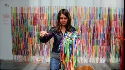 In Ms. Neuenschwander’s conceptual-art variation, which will be displayed at the rear of the New Museum’s lobby, colorful silk ribbons have each been stamped with one of 60 wishes left by previous viewers of the piece. The show’s visitors can take a ribbon from one of 10,296 small holes in the wall in exchange for scribbling a new wish on a slip of paper and inserting it into the hole. “When I was starting off, I was very interested in the ephemeral, in quotidian materials that disappear or are subject to entropy, which is how my art got stuck with labels like ‘ethereal materialism,’ ” she explained.