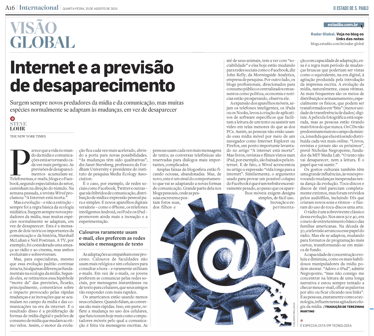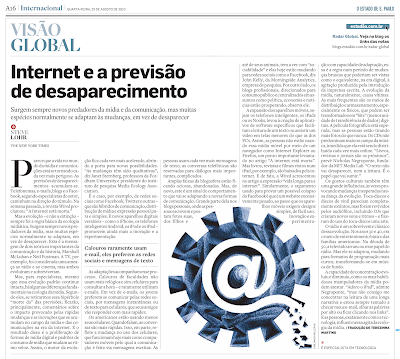 Ainda no tema do que está acontecendo com a internet e o que está acontecendo com as nossas mentes expostas ao uso da rede por mais de uma década, vem este interessante artigo de Steve Lohr, colunista de tecnologia do New York Times, publicado no Estadão de hoje.