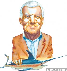 In black trousers, open-necked shirt and checked jacket, he has certainly tried to look ordinary. Tanned and trim (when at home in New York, he works out in the pool at his Manhattan town house), Gagosian speaks softly, slowly, deliberately, as if to undercut his powerful image.