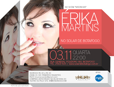 No próximo dia 03 de novembro (quarta-feira), a cantora Érika Martins apresenta pela primeira vez o show “Modinha”, no Solar de Botafogo.