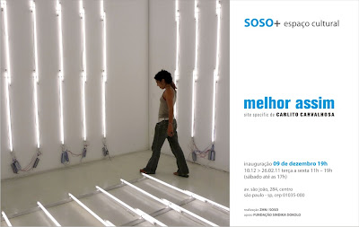 “A gente vê através da luz. Mas, e se ela fosse tanta que nos impedisse de enxergar normalmente e, assim, propusesse outras formas de perceber os espaços?”. A partir desta provocação, o artista paulista residente no Rio de Janeiro, Carlito Carvalhosa, criou uma instalação com cerca de 330 lâmpadas de 40 watts, instaladas nas paredes, no chão e no teto da SOSO+ Espaço Cultural (Avenida São João, São Paulo). O resultado dessa experiência pode ser conferido a partir do dia 09 de dezembro, às 19h, com a abertura da sua exposição Melhor Assim, em cartaz até do dia 26 de fevereiro de 2011.